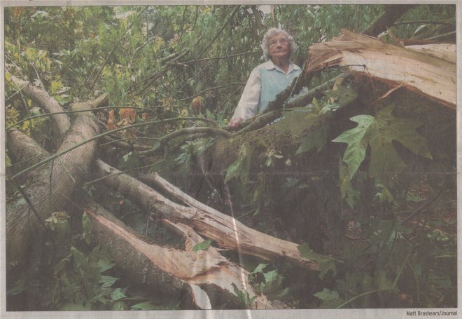LOCAL WEATHER PHOTO by Matt Brashears/Journal: Lightning from a Sunday storm felled a large maple tree that Kent's Edith Brandon planted more than 40 years ago. The Sunday thunderstorm damaged a half dozen other large trees, which she was advised to remove. "I didn't invite it, that's for sure," Brandon said of the lightning. Lightning crackles through backyard trees: Kent woman loses several trees, one woodpecker2003-08-13 KENT -- It looks like lightning played a game of leap-frog in the back yard. While awaiting the insurance adjuster Tuesday afternoon, Edith Brandon pointed to where a powerful lightning bolt split the trunk of a towering Douglas fir tree. It looks like the bolt then jumped about 15 feet this way, blasting apart the trunk of a maple tree, then another 20 or so feet that way, blowing strips of bark and small branches off the trunk of another large Douglas fir. Nearby, Brandon found a dead woodpecker on the ground. "This is something you don't see every day around here, thank goodness," Brandon said, surveying the aftermath of the lightning strike. A tree service told her the lightning that struck the yard of her East Hill home during Sunday's thunderstorm damaged a half dozen large trees, which should be removed. Brandon and her visiting daughter didn't see the lighting strike, but were startled by a boom loud enough to rattle the windows. "Sunday, 10 minutes to 9," Brandon recalled, "it sounded like our whole house was blowing up. It scared the life out of us." Neighbors came running and saw the damage and fallen trees. "The guy across the street said, `I'm going to miss those trees,' and I'll sure miss them, too," said Brandon, who is "90 and a half" years old and still tends to much of the yardwork. She and family members have watched the trees grow for decades. They purchased dozens of trees from an Auburn nursery that was going out of business more than 40 years ago and planted them around their large home lot in the Starcrest subdivision near Southeast 230th Street and 132nd Avenue Southeast. Thunderstorms and lightning strikes swept across the state last week, sparking some wildland fires elsewhere in Washington. The weekend storms also brought traces of rain. The weather station at Sea-Tac Airport recorded 0.13 inches of rainfall Sunday and 0.14 inches of rain on Saturday. Those readings and 0.05 inches on Aug. 5 account for the measurable precipitation so far this month. While lightning strikes are reported infrequently around King County, thunderstorms aren't all that uncommon in the Puget Sound region. "It's not out of the ordinary, it's just that we have a lower frequency of thunderstorms around Puget Sound," said Ted Buehner, a meteorologist with the National Weather Service office in Seattle. Residents of the Puget Sound basin can expect to see perhaps 10 thunderstorms per year, while those in Eastern Washington will see 10 to 20, Buehner said. Florida is at the top of the list, averaging about 200 thunderstorms annually, he said. Edith Brandon said Sunday's lightning strike was the first she's experienced, and she hopes it will be the last. Besides the two damaged fir trees, the maple tree felled by the lightning strike also dragged a nearby Western hemlock to the ground. "I hate to see all these trees gone. It was like we had a little forest of our own out here," she said. All materials Copyright © 2003 Horvitz Newspapers, Inc.Any questions? See our contact page.